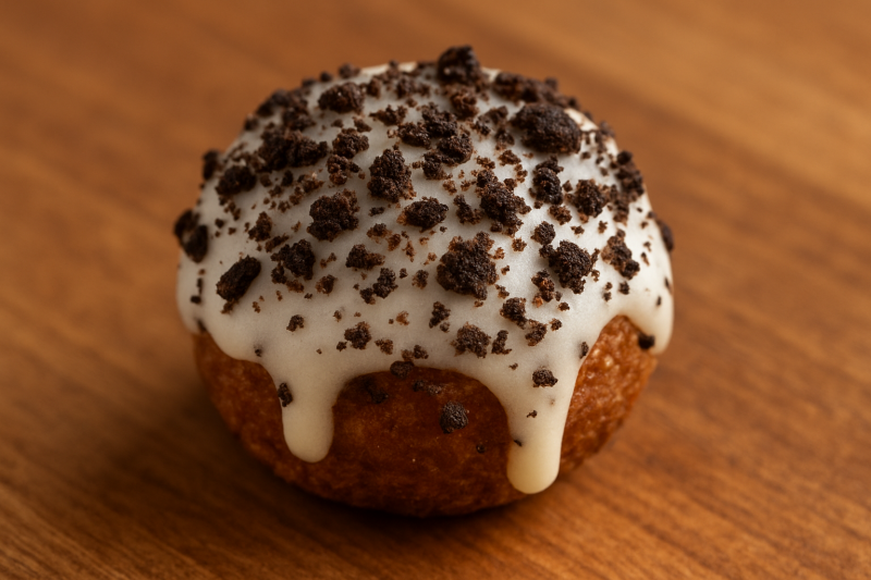 This donut hole wears a crushed cookie crown over silky vanilla glaze, giving you the creamy-chocolate combo you love—without needing a spoon. It’s part donut, part cookie, part cake-pop energy, and 100% guaranteed to disappear fast. Serve with a milkshake. No regrets.