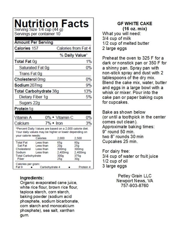 Want to whip up a fabulous white cake without the fuss? You've got it! Our Gluten-Free White Cake Mix is designed for easy baking. Just mix in milk (or water/juice), melted butter (or oil), and eggs (or a dairy-free swap), and follow our simple steps to bake at 325°F (dark pan) or 350°F (shiny pan). Whether you're baking a towering 9-inch round, adorable cupcakes, or a double-layered treat, Petley Grain makes it fun and foolproof."Quality